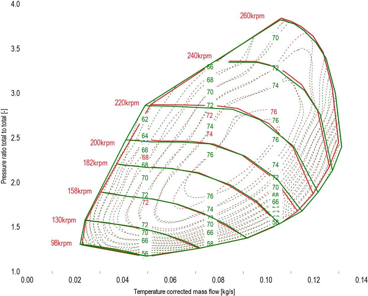 The turbocharger’s operating parameters (compression ratio, mass flow rate, and efficiency) show differences of no more than ±1% compared to the original model’s values, which means that the design objectives have been achieved.