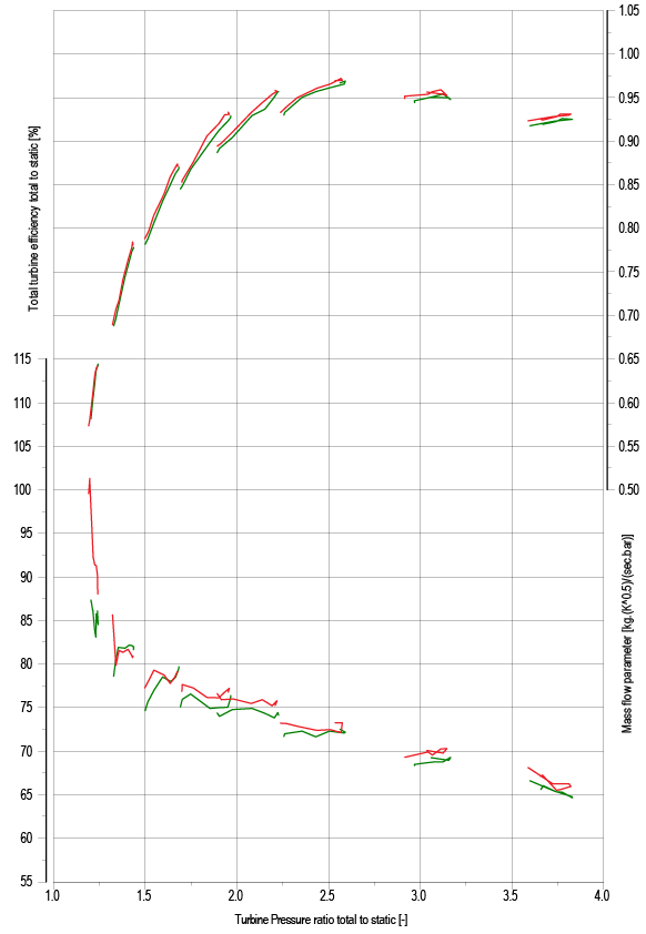 The ASAM turbocharger achieves performance very close to the original reference, with turbine flow and efficiency differences within ±1% at the same expansion ratio, thus meeting the design requirements.
