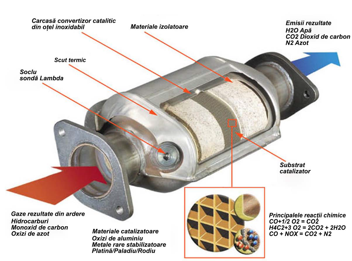 + Tricat (three-way): Pentru motoarele pe benzină (reduce CO, HC și NOx simultan).