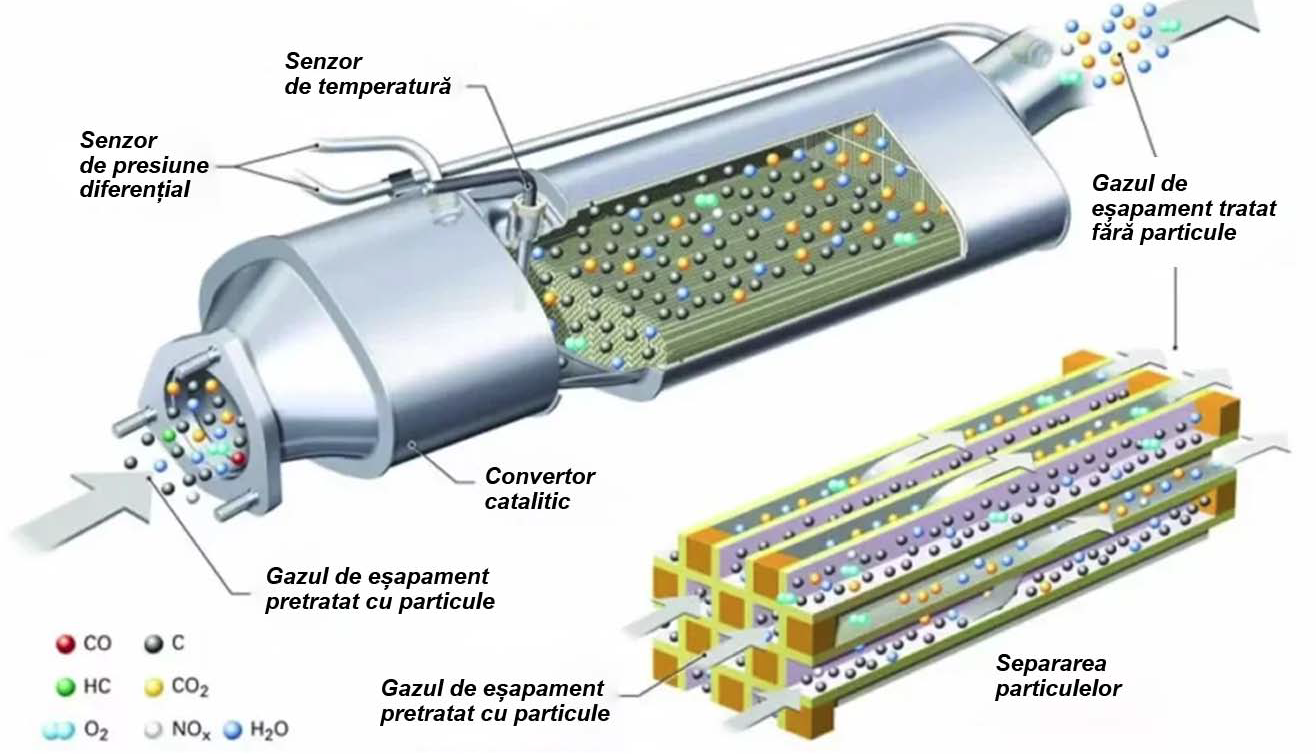 + Regenerare activă: Computerul mașinii injectează combustibil suplimentar pentru a crește temperatura și a arde depunerile (se activează la ~500°C).