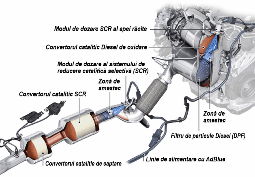 AdBlue (soluție de uree și apă demineralizată) este injectată în sistemul de eșapament înaintea catalizatorului SCR. Reacția chimică: transformă NOx (poluant toxic) în azot și apă, inofensive.